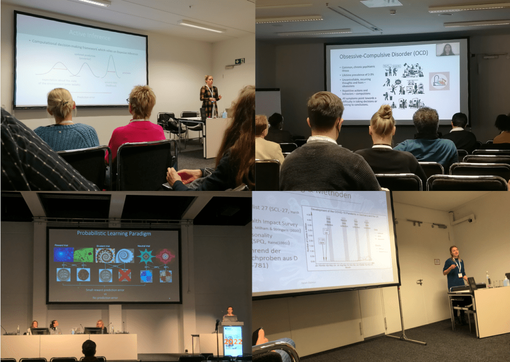 November 23-26, 2022, continued: At the DGPPN, Elisabeth gave a presentation on action selection in psychosis (upper left), Pritha talked about model free and model based decision making in OCD (upper right), Franziska reviewed findings on reward and salience processing in psychosis (lower left) and Sarah presented data on the impact of the COVID-19 pandemic on the increase of schizotypal traits in the general population (lower right).
