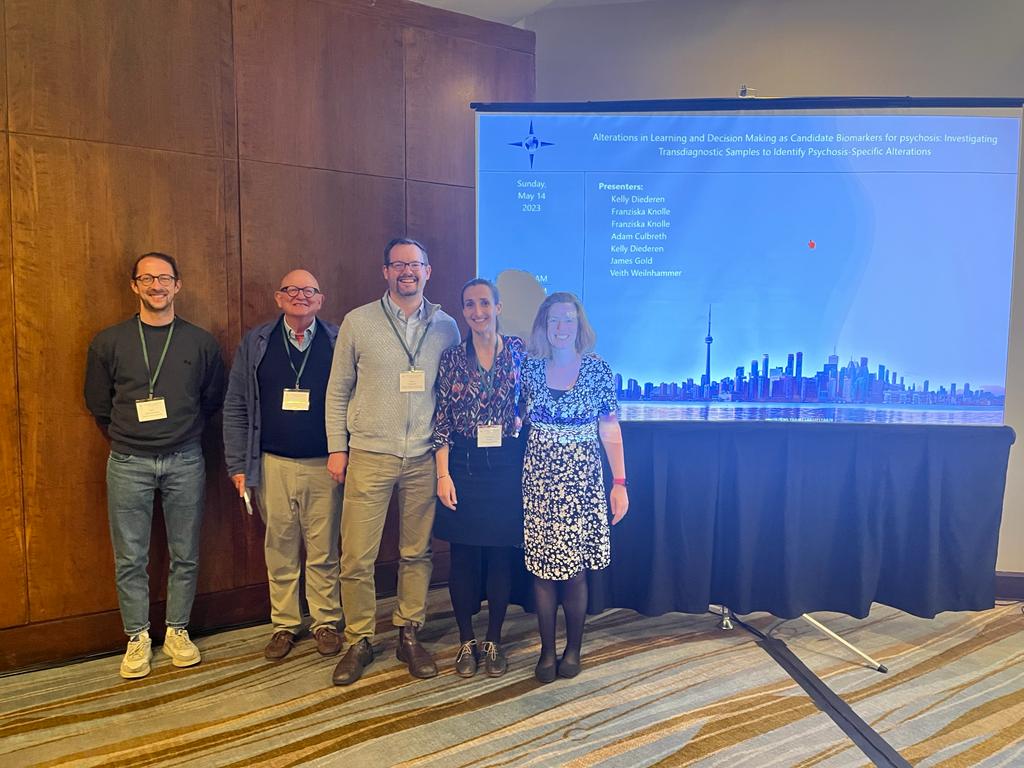May 10-15, 2023: At the SIRS in Toronto, Kelly Diederen (KCL) and Franziska chaired two symposia on the same day. The first one was on Alterations in Learning and Decision Making as Candidate Biomarkers for psychosis: Investigating Transdiagnostic Sample to Identify Psychosis-Specific Alterations with speakers being Adam Culbreth and James Gold in addition to Kelly and Franziska, and Veith Weilnhammer as discussant. We had great discussions!