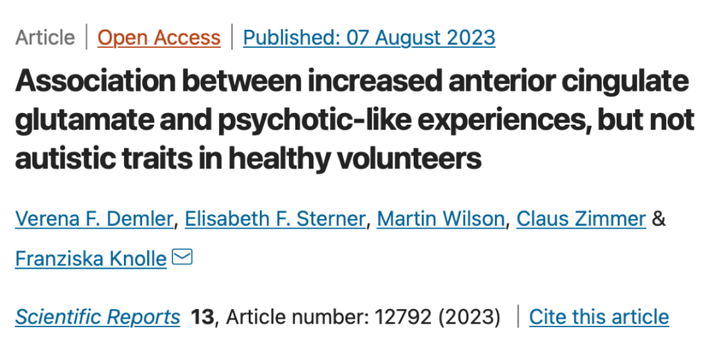 August 7, 2023: Verena’s first paper has been published in Scientific Reports showing levels of cortical glutamate increasing with stronger psychotic-like experiences but not autistic traits. 🎉☺️