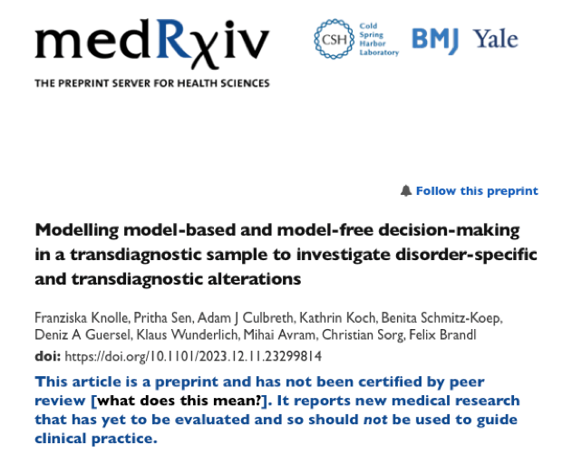 December 12, 2023: Pritha and Franziska published their first pre-print together, investigating model-based and model-free decision making in a transdiagnostic sample! 🎉🤞