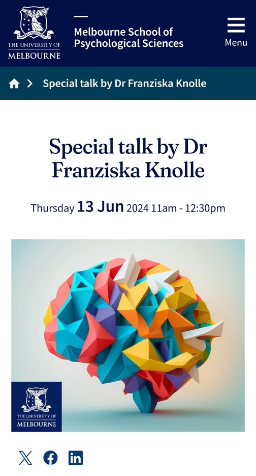 June 13, 2024: Franziska gave a talk on Alteration in predictive language processing in different stages of psychosis at the Melbourne School of Psychological Sciences, University of Melbourne, chaired by Prof. Marta Garrido.