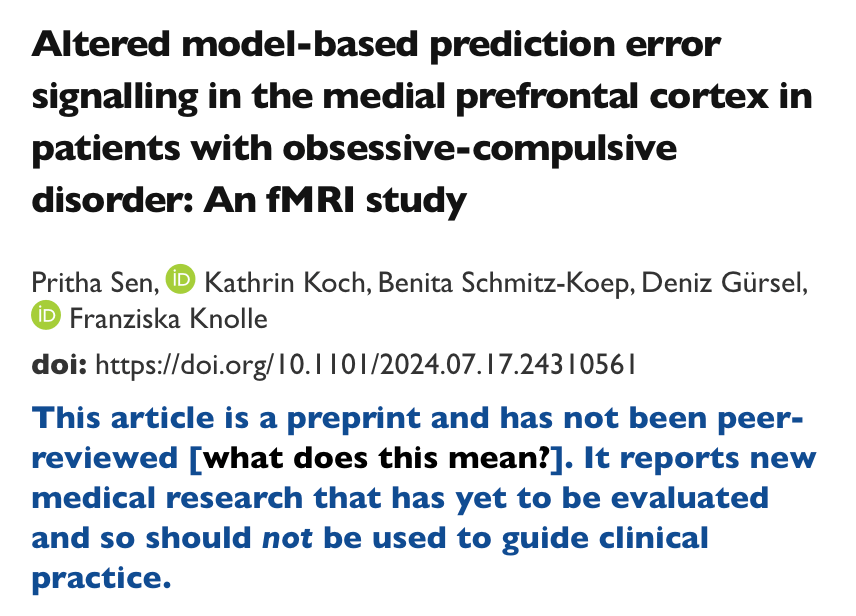 July 24, 2024: Pritha and Franziska posted their next preprint on altered prefrontal prediction error signals in OCD. 👏