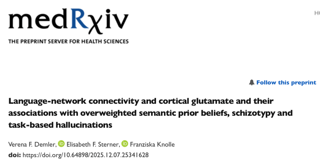 November 14, 2024: Franziska, Elisabeth and Verena have finally published a preprint for their novel Predictive Language Task. They found that semantic priors are overweighted in individuals with schizotypy, and linked to cortical glutamatergic alterations, possibly explaining non-clinical hallucinations. This paper provides insights into the computational and neurobiological mechanisms underlying psychotic symptoms. Also see 🧵on X! 🎉🧠